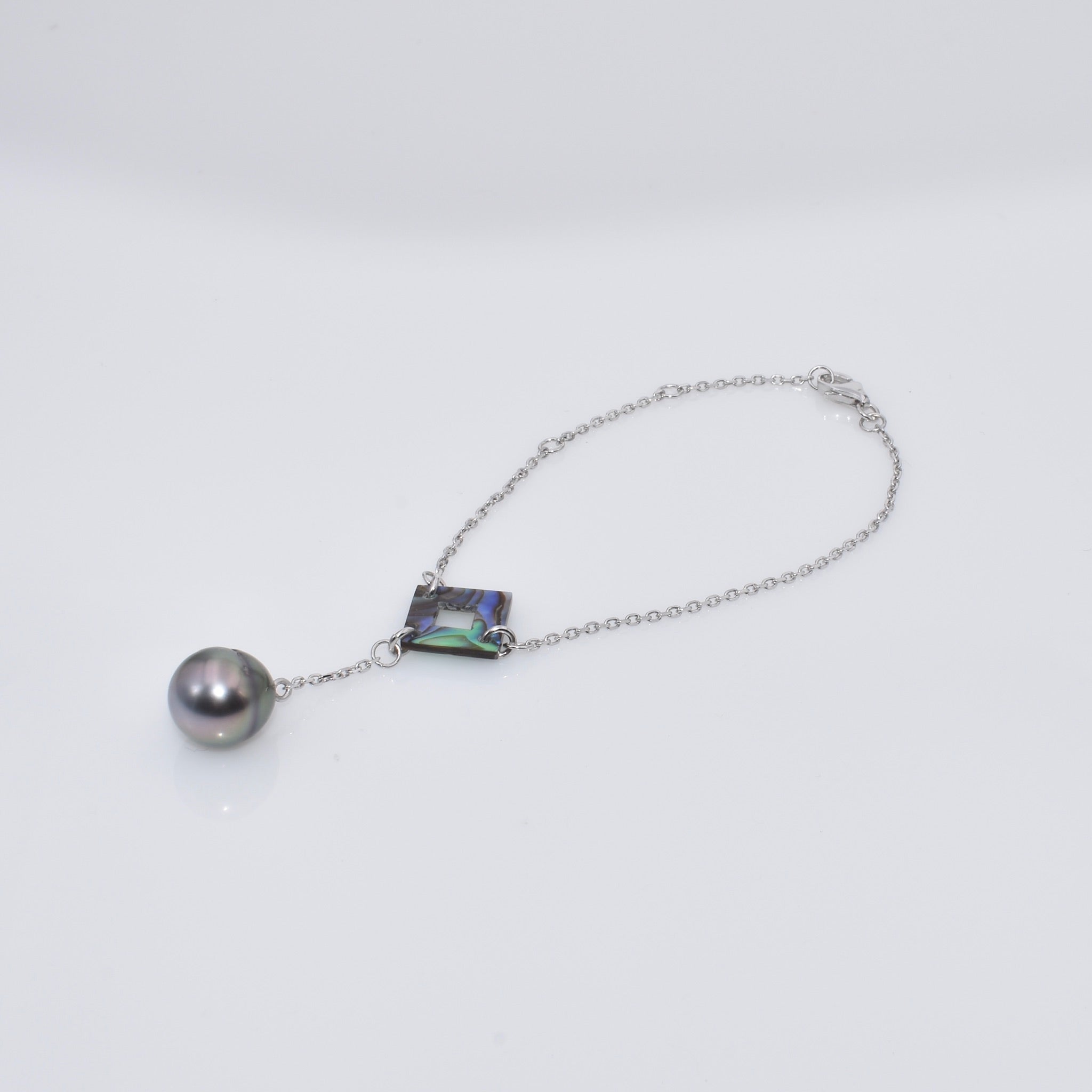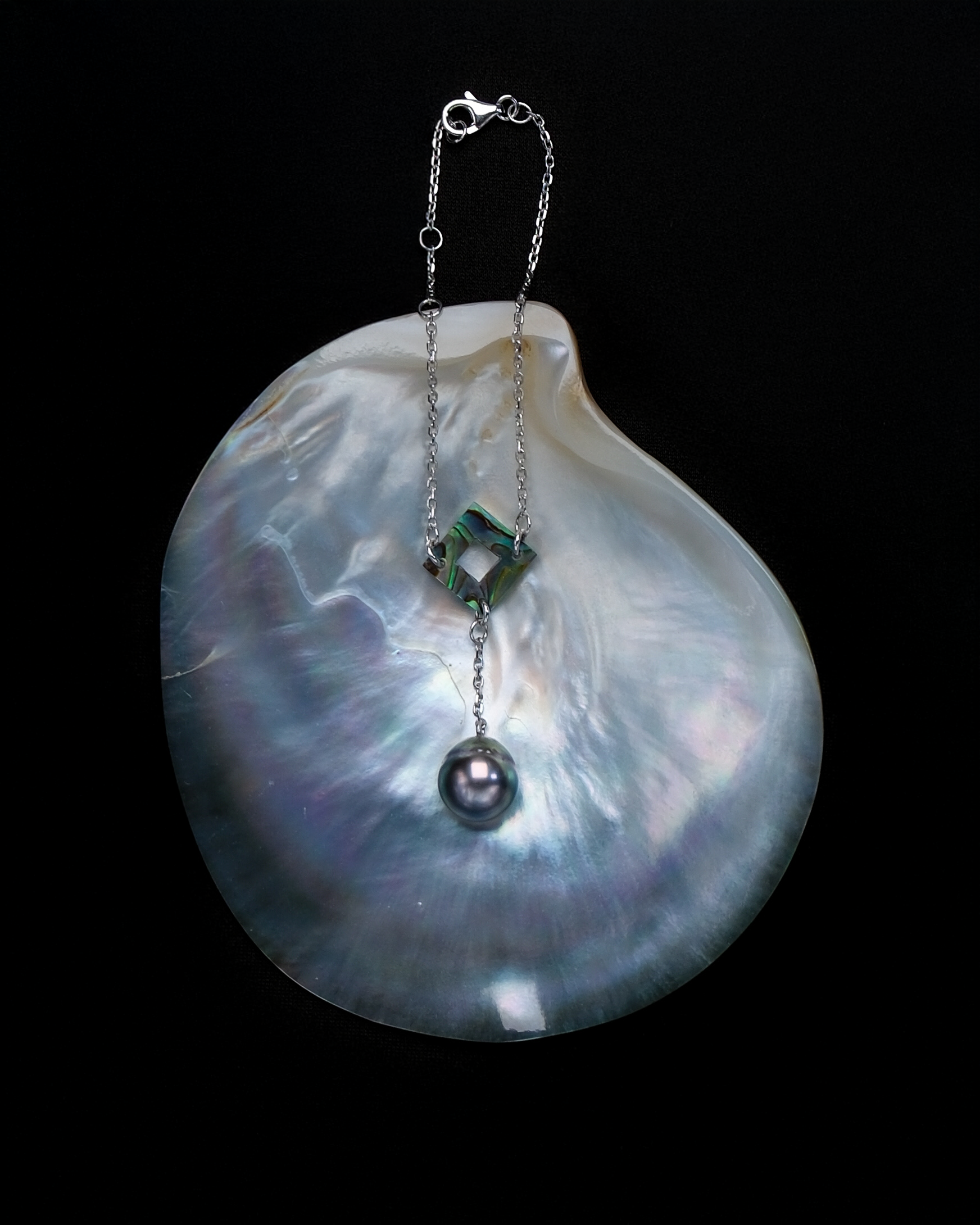A Tahitian pearl anchored by a sculpted square of iridescent abalone shell.