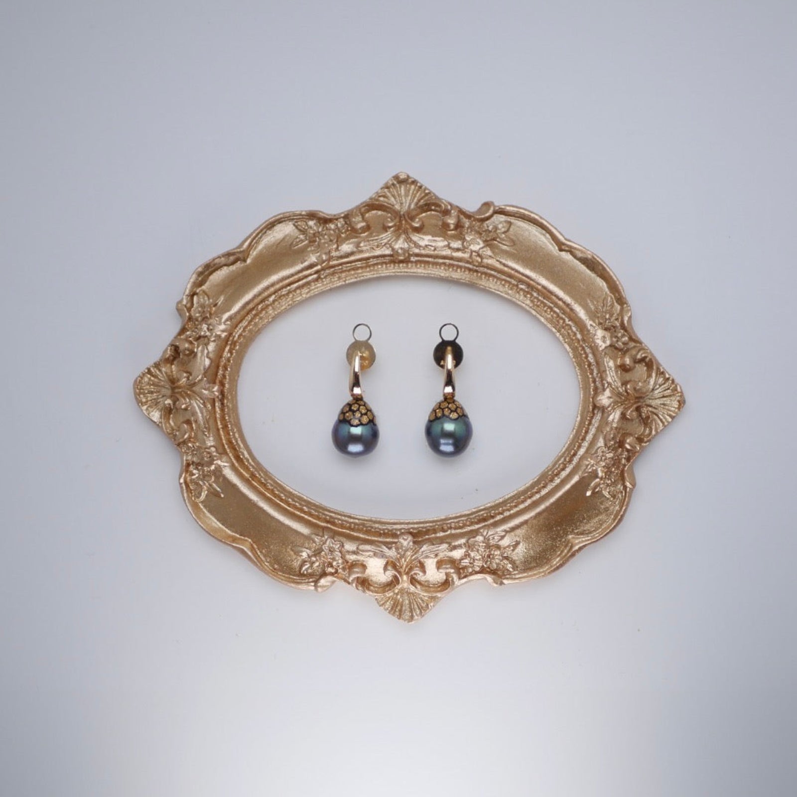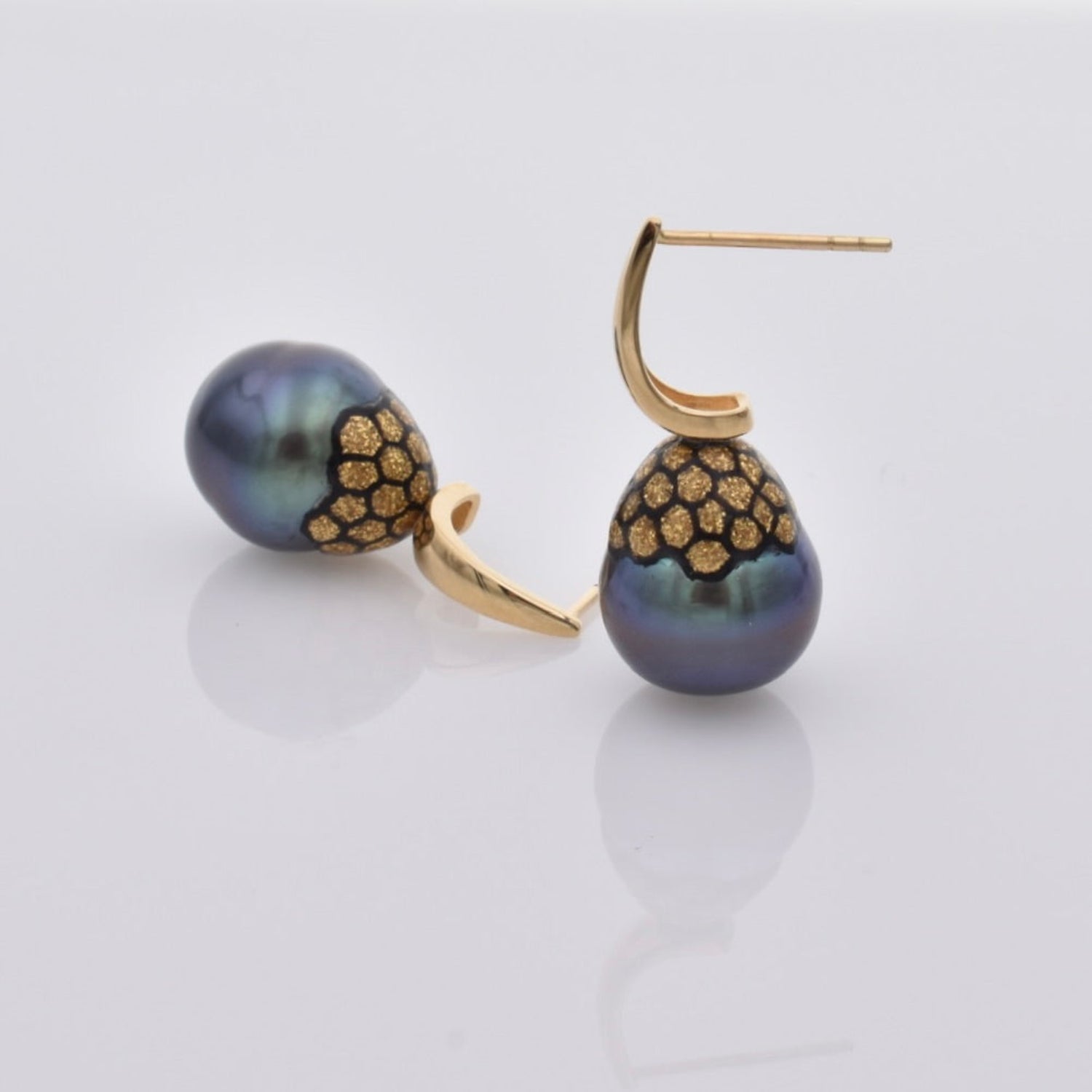 The Amber Nectar Earrings capture the warmth and brilliance of honeycomb in a breathtaking design. Each earring features a 10-11mm drop-circled Tahitian pearl, its intense color enhanced with 24K yellow gold glitter and organic urushi lacquer, radiating a rich, golden glow.
