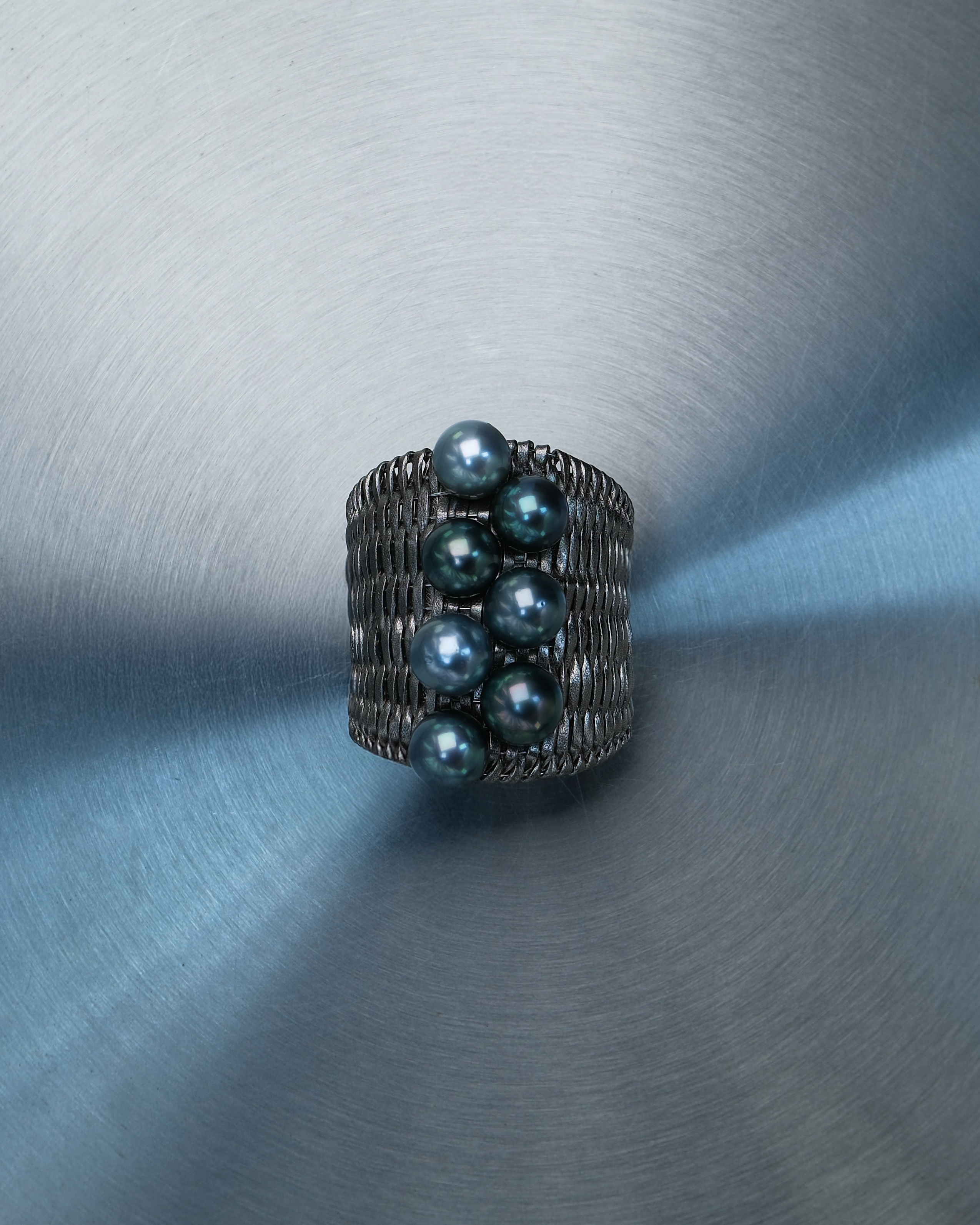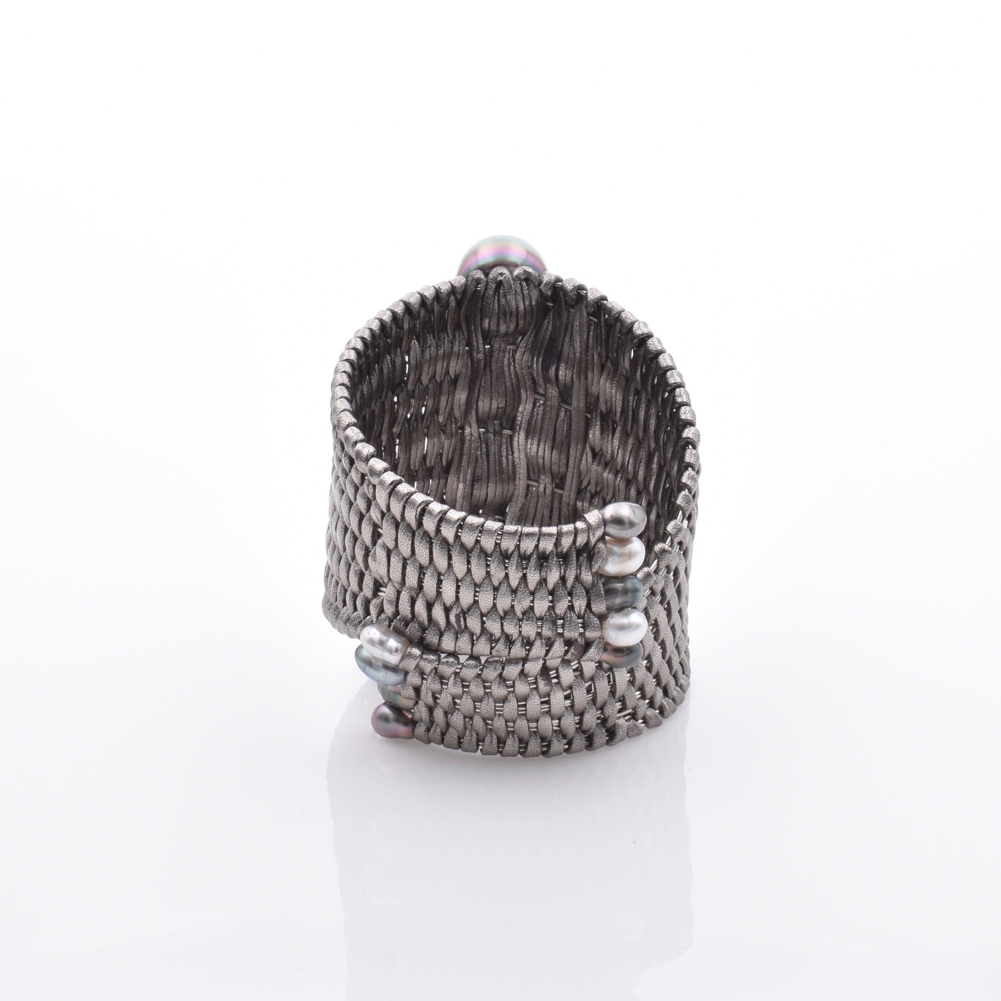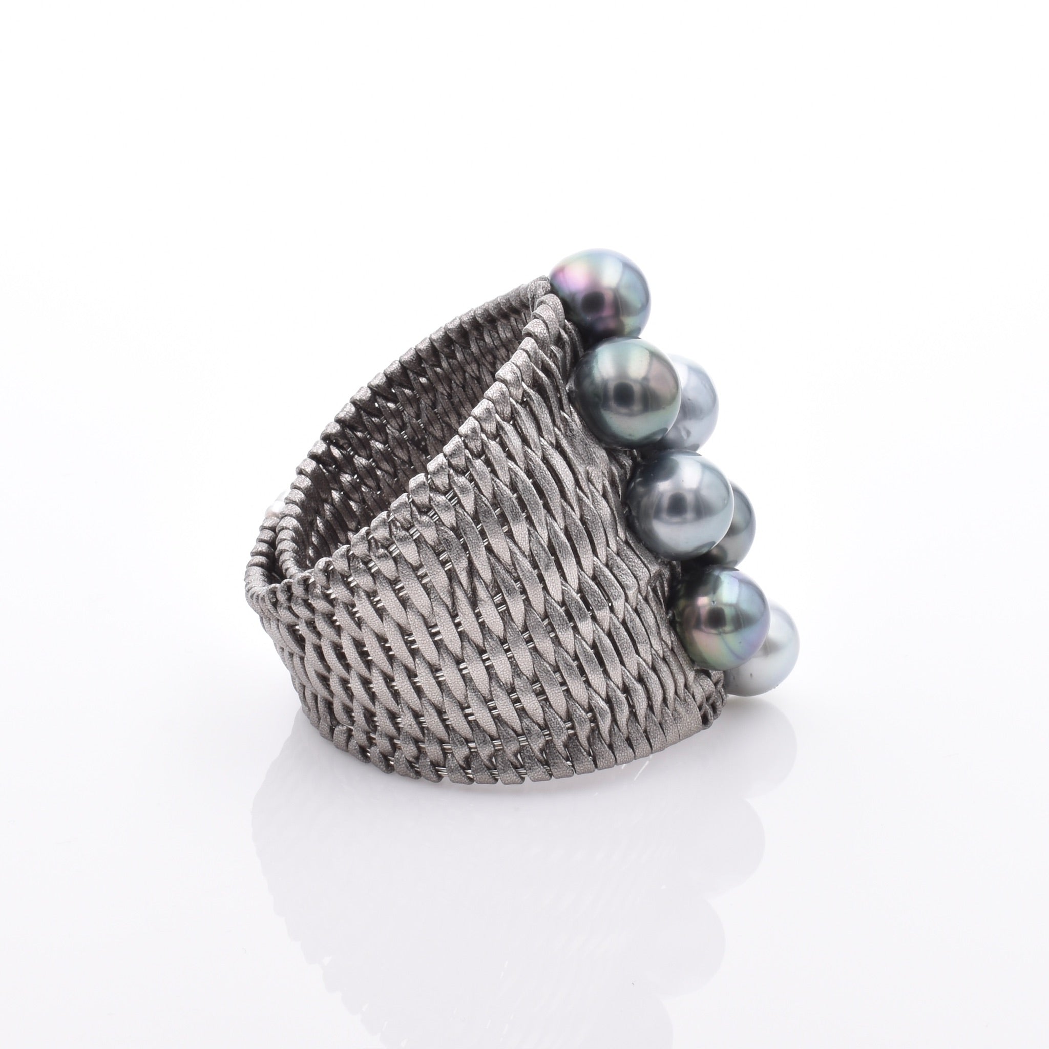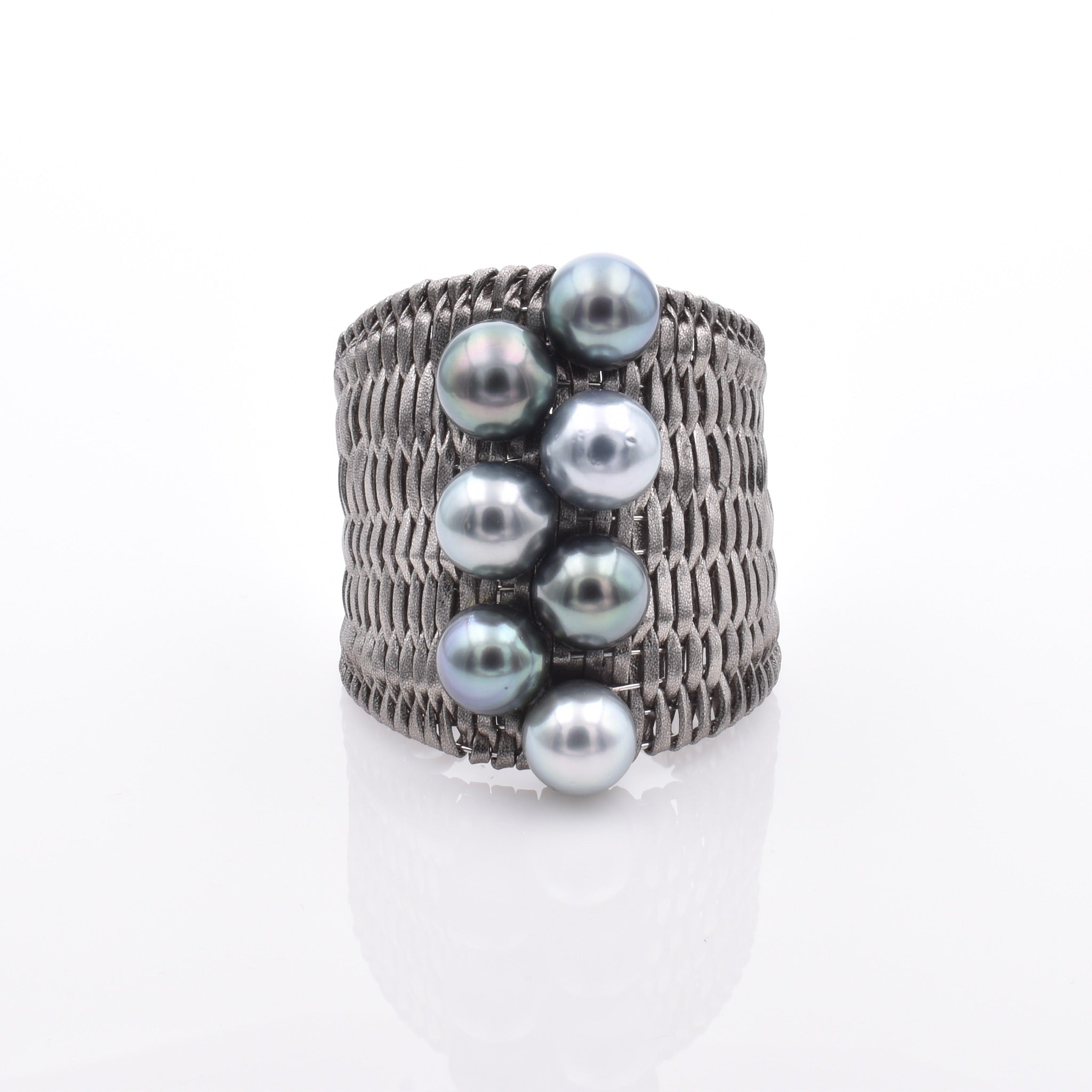 A bold statement cuff handwoven from natural leather, punctuated with multicolored Tahitian pearls and keshi accents. Textural, grounded, and sculptural — a study in contrast and craftsmanship.